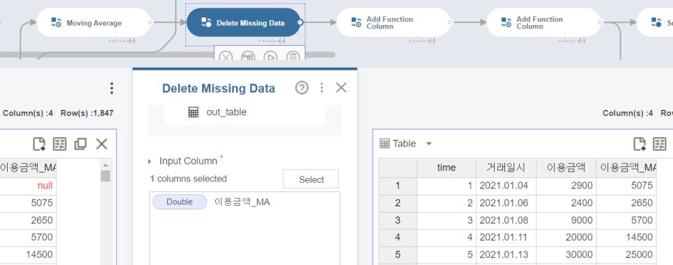 이전에 생성된 칼럼에 있는 NULL값을 Delete Missing Data함수를 활용해 없애줍니다.