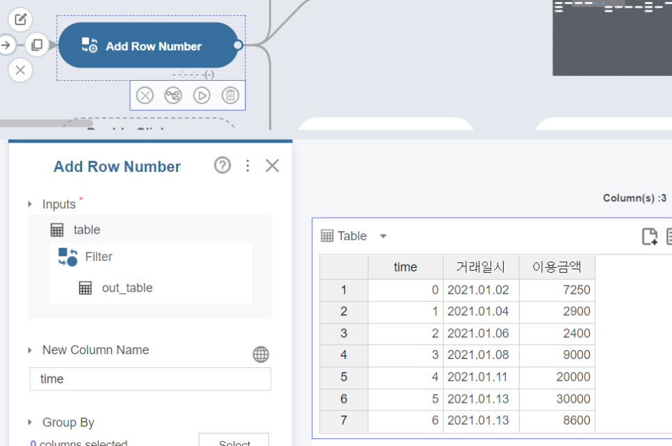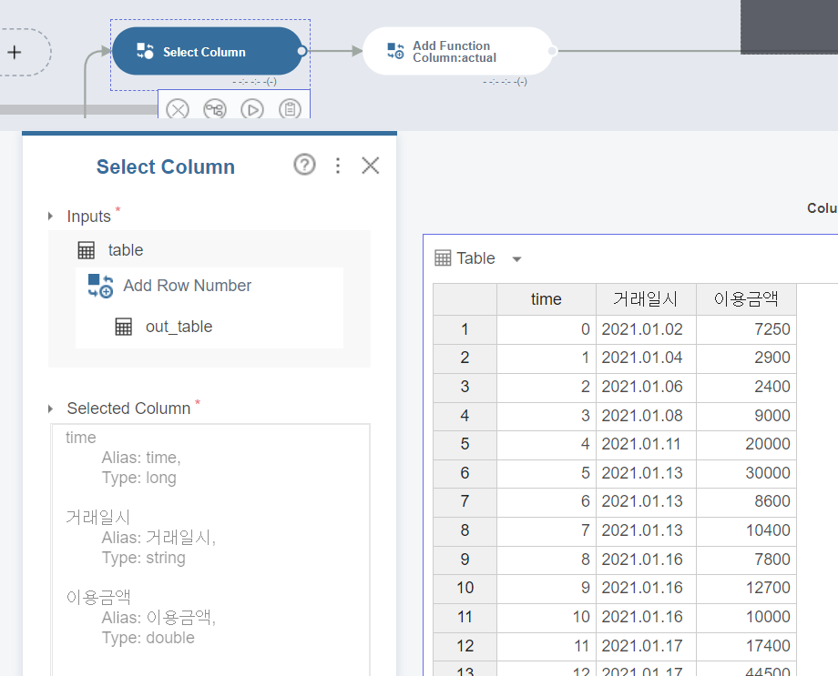 전처리가 완료된 Add Row Number함수에서 Select Column 처리를 하여 time, 거래일시, 이용금액 컬럼만 가져와봅니다.