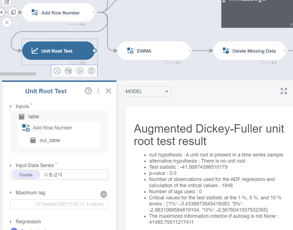 p-value 값이 0.0으로 정상성을 만족 하는 결과를 보여주고 있습니다.