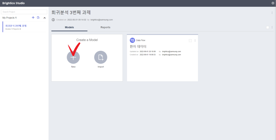 실행된 Brightics에서 모델 생성 (Create a Model)에 있는 +(New)버튼 클릭