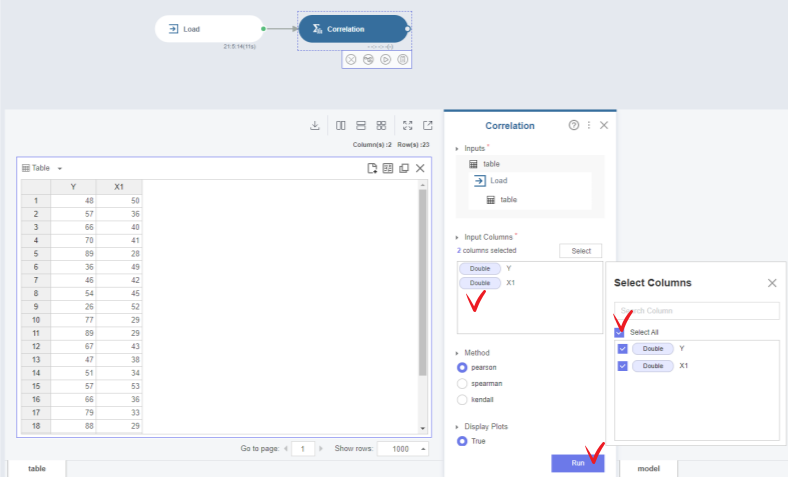 columns selected 는 독립변수로 X1 데이터를 설정