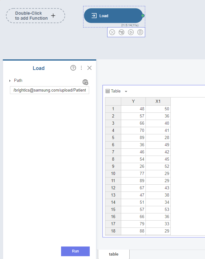 삼성 SDS Brightics Studio를 사용하여 단순선형회귀분석을 실행해 봤습니다.